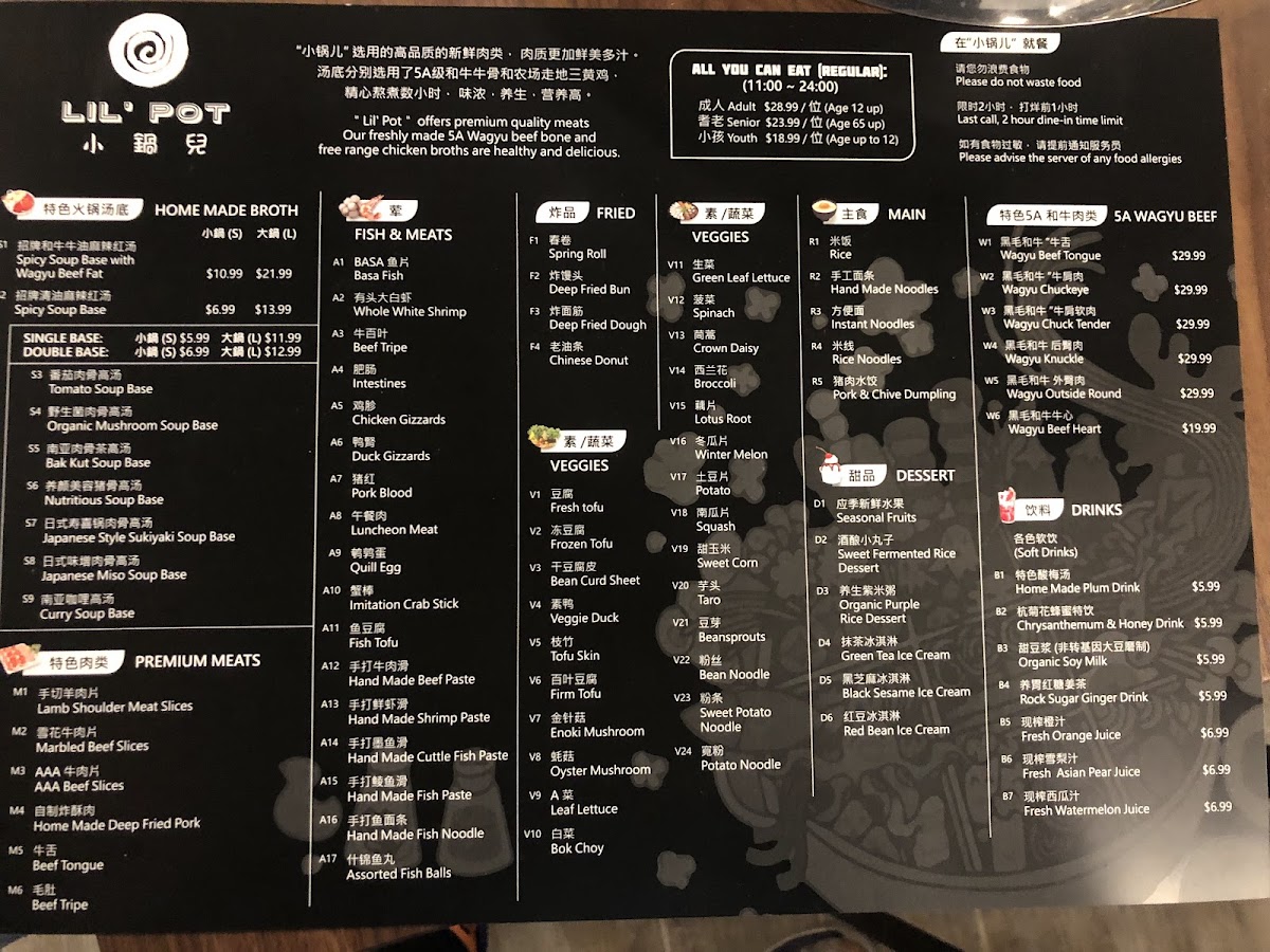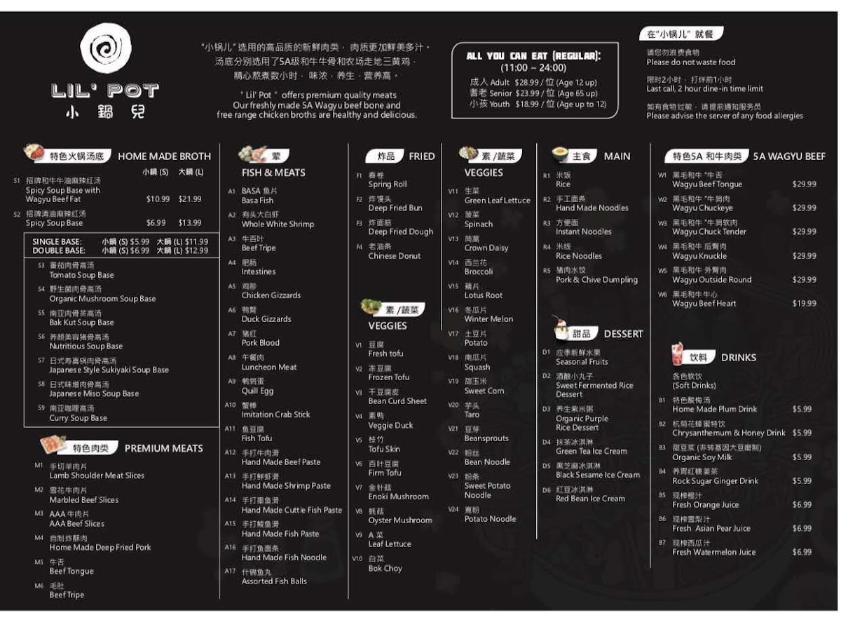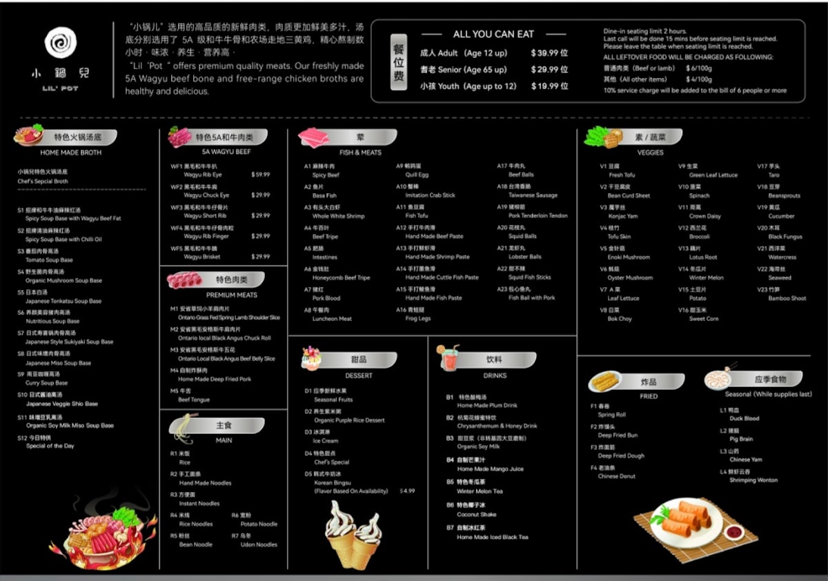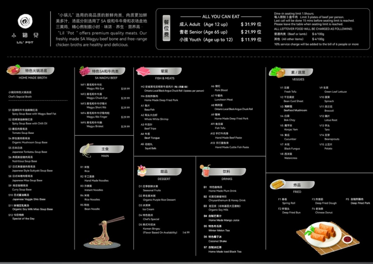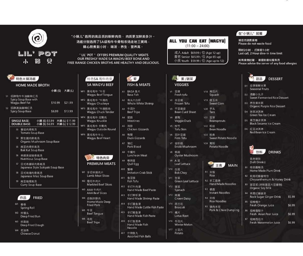 As you step into the cozy atmosphere of Lil' Pot, you're greeted by the enticing aroma of simmering broths and a selection of fresh ingredients that beckon from the menu. What sets Lil' Pot apart is its all-you-can-eat (AYCE) format, allowing you to explore a wide variety of broth options, from the delightfully spicy to the warm and comforting miso. The joy of selecting from a diverse range of meats, vegetables, and dim sum adds an exciting, hands-on element to your meal.
